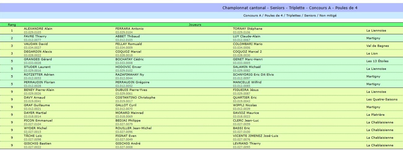 Championnat Valaisan triplettes 2025 : Concours A Seniors